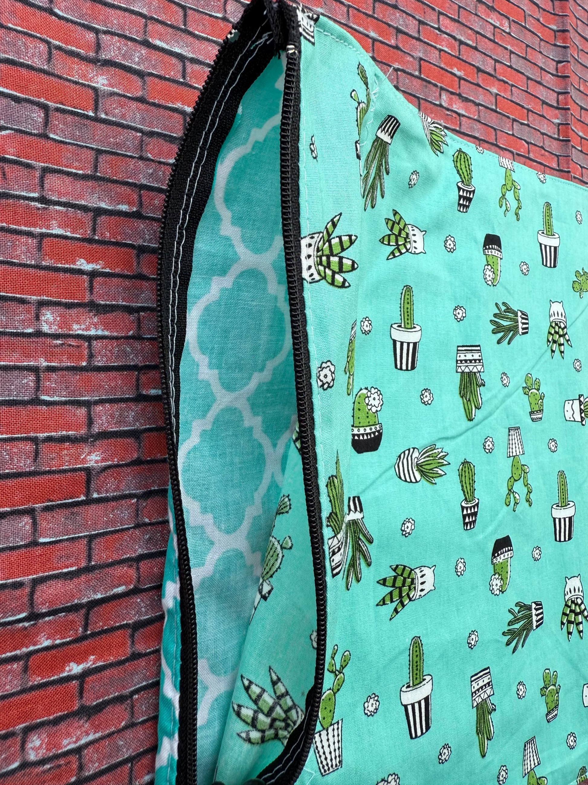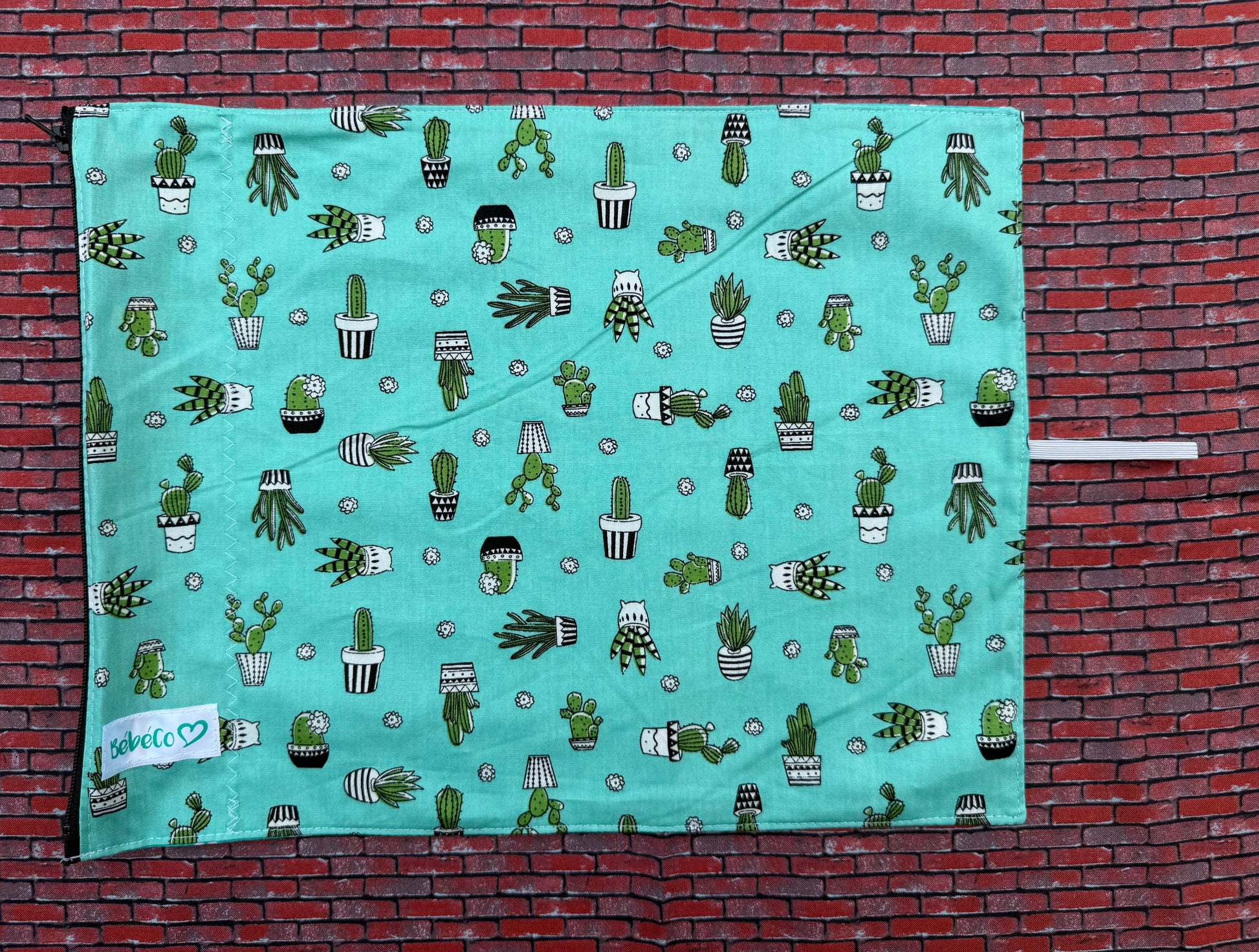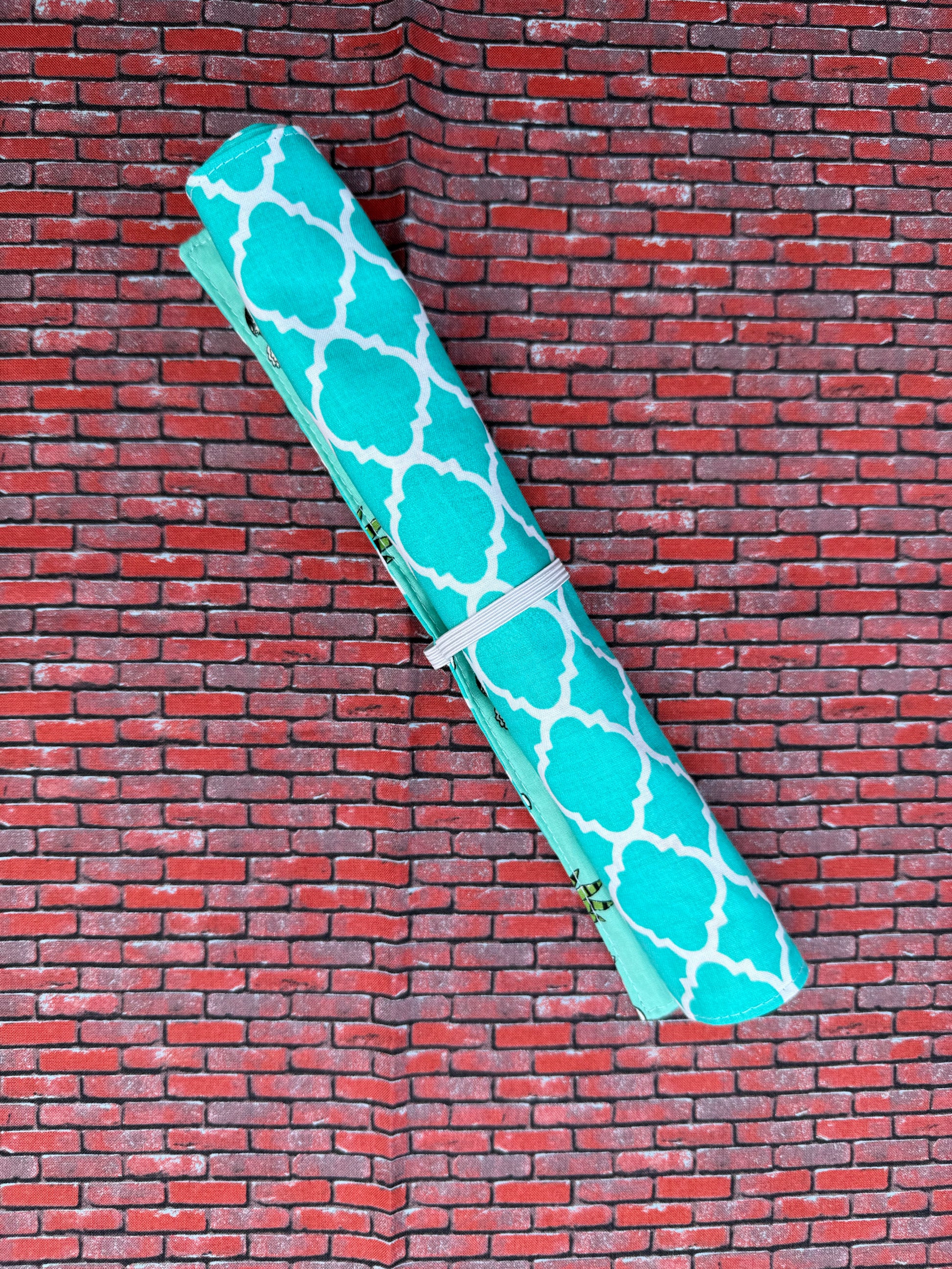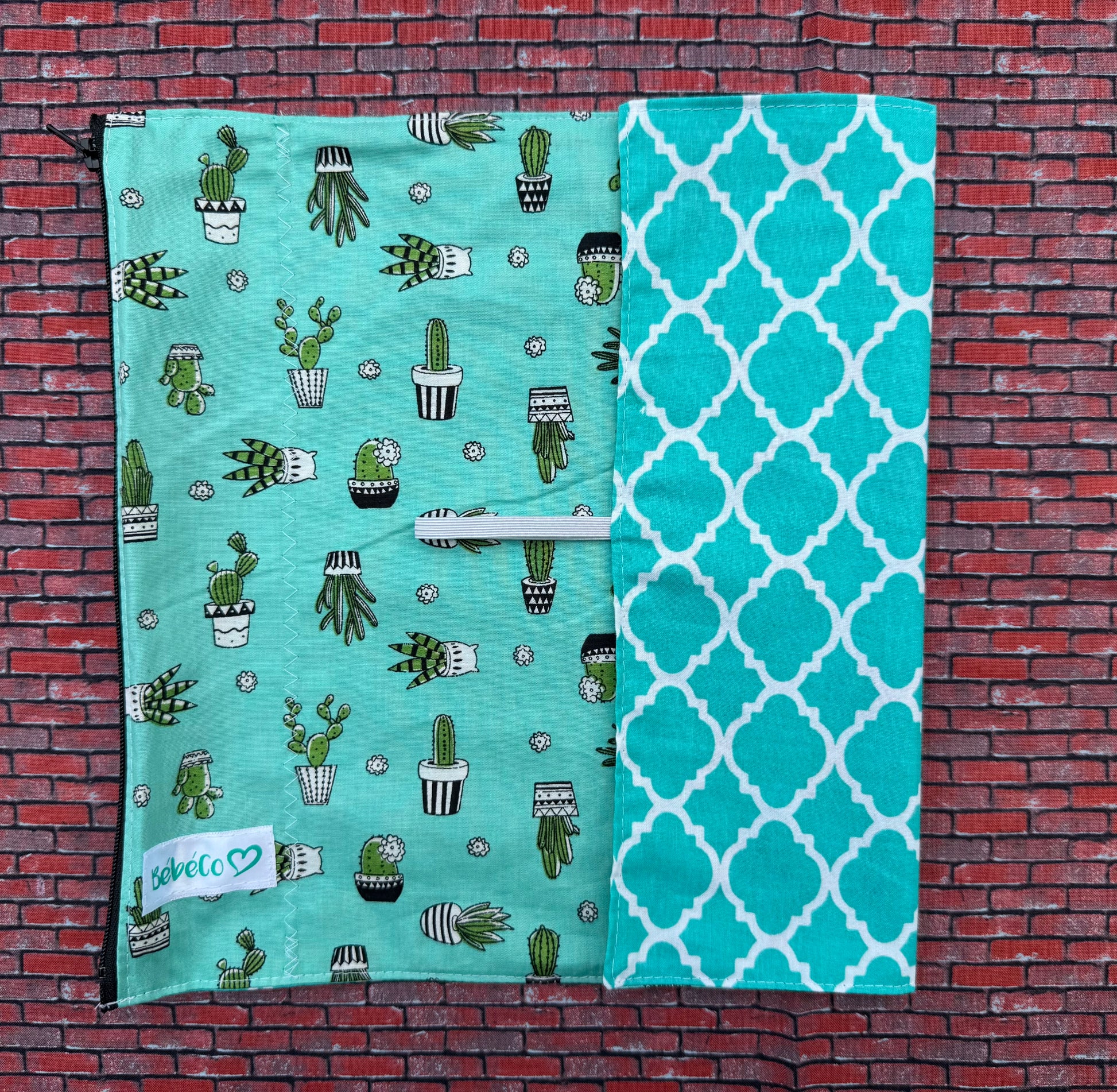 Petit napperon en coton avec pochette pour les ustensiles. Très facile à ranger on le roule et on attache avec l'élastique. Le napperon est également réversible, un motif plus intense au devant et un motif plus neutre à l'endos.