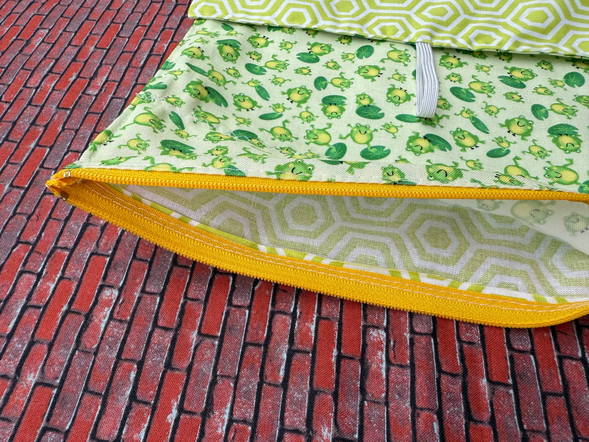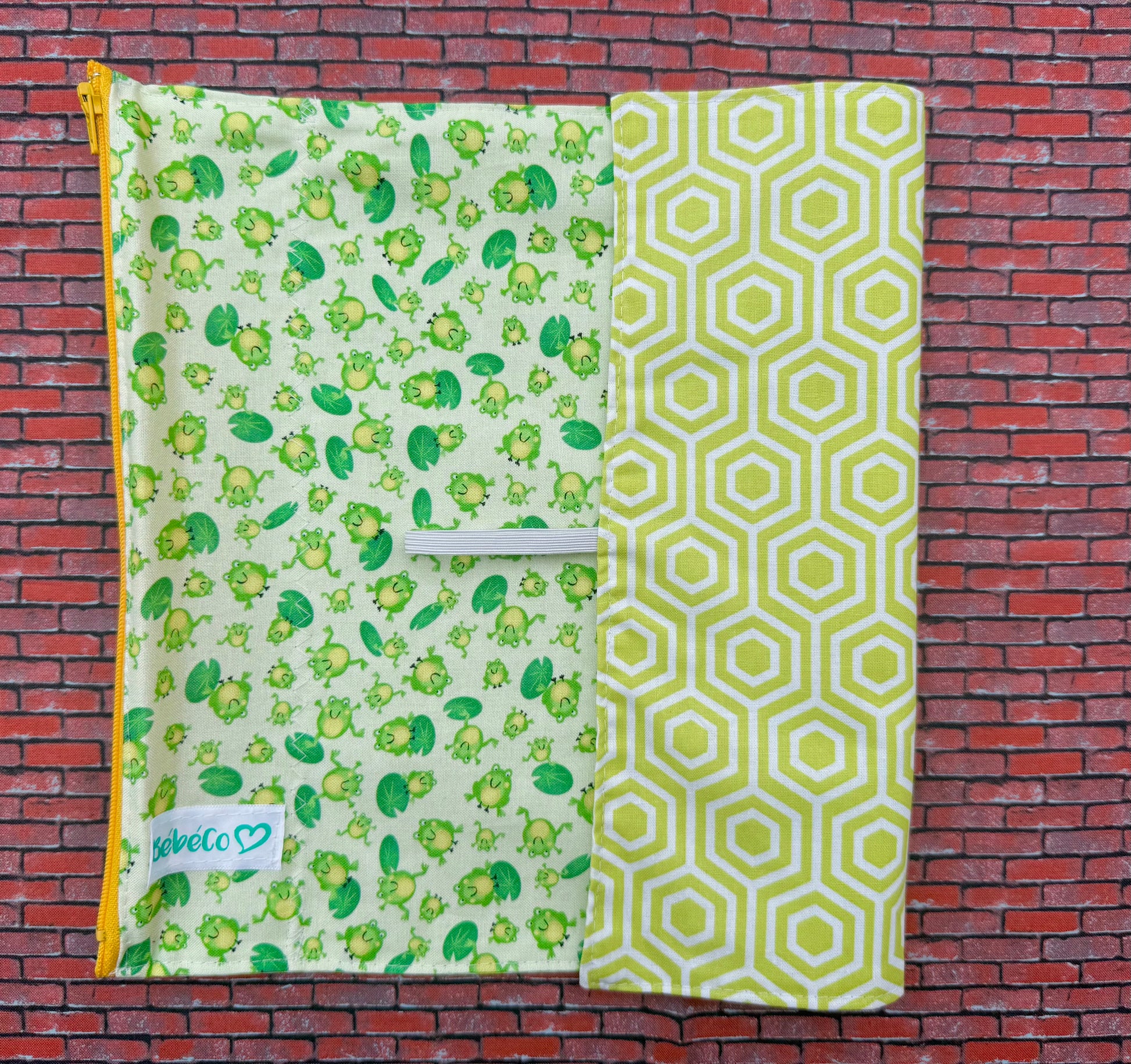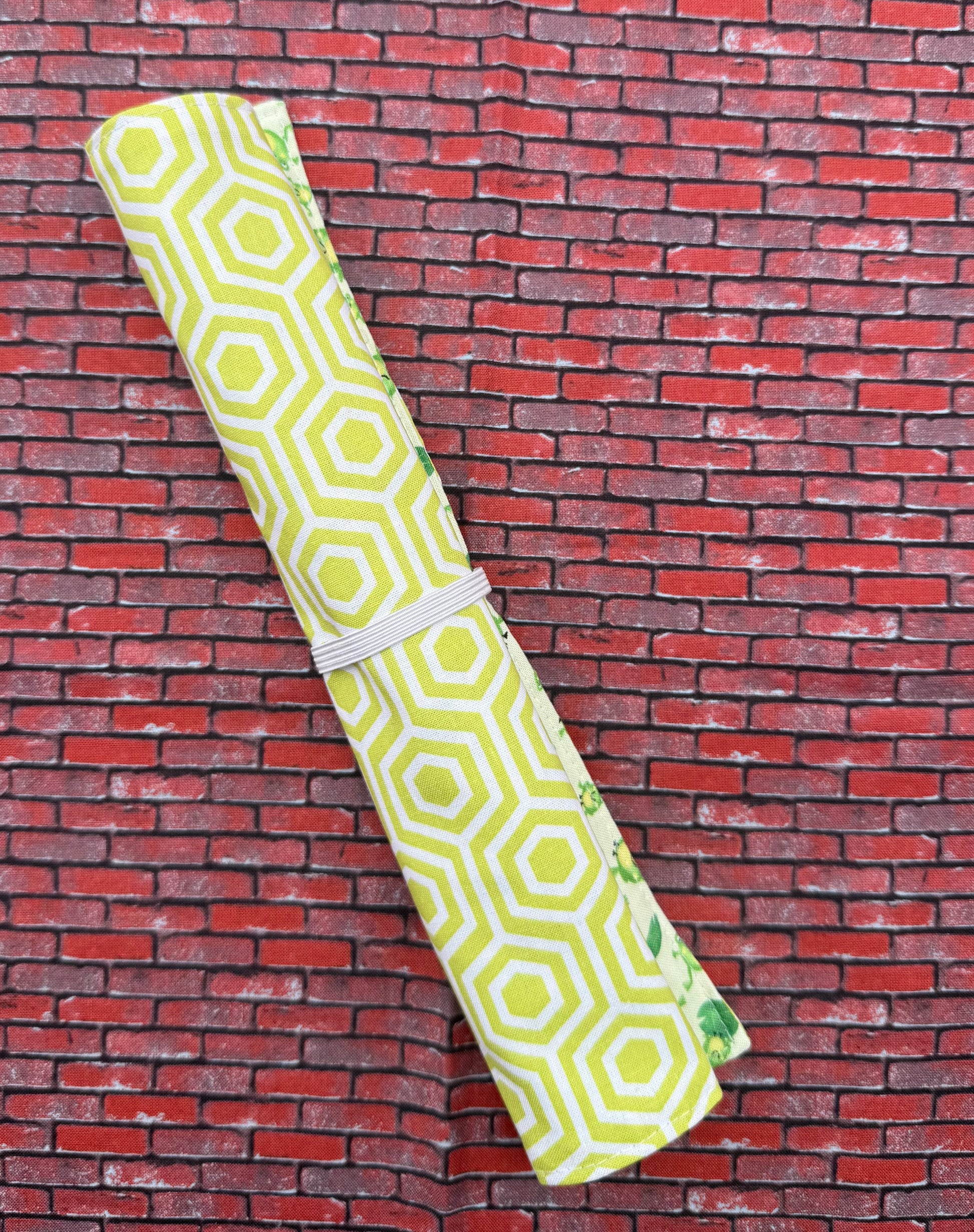 Petit napperon en coton avec pochette pour les ustensiles. Très facile à ranger on le roule et on attache avec l'élastique. Le napperon est également réversible, un motif plus intense au devant et un motif plus neutre à l'endos.
