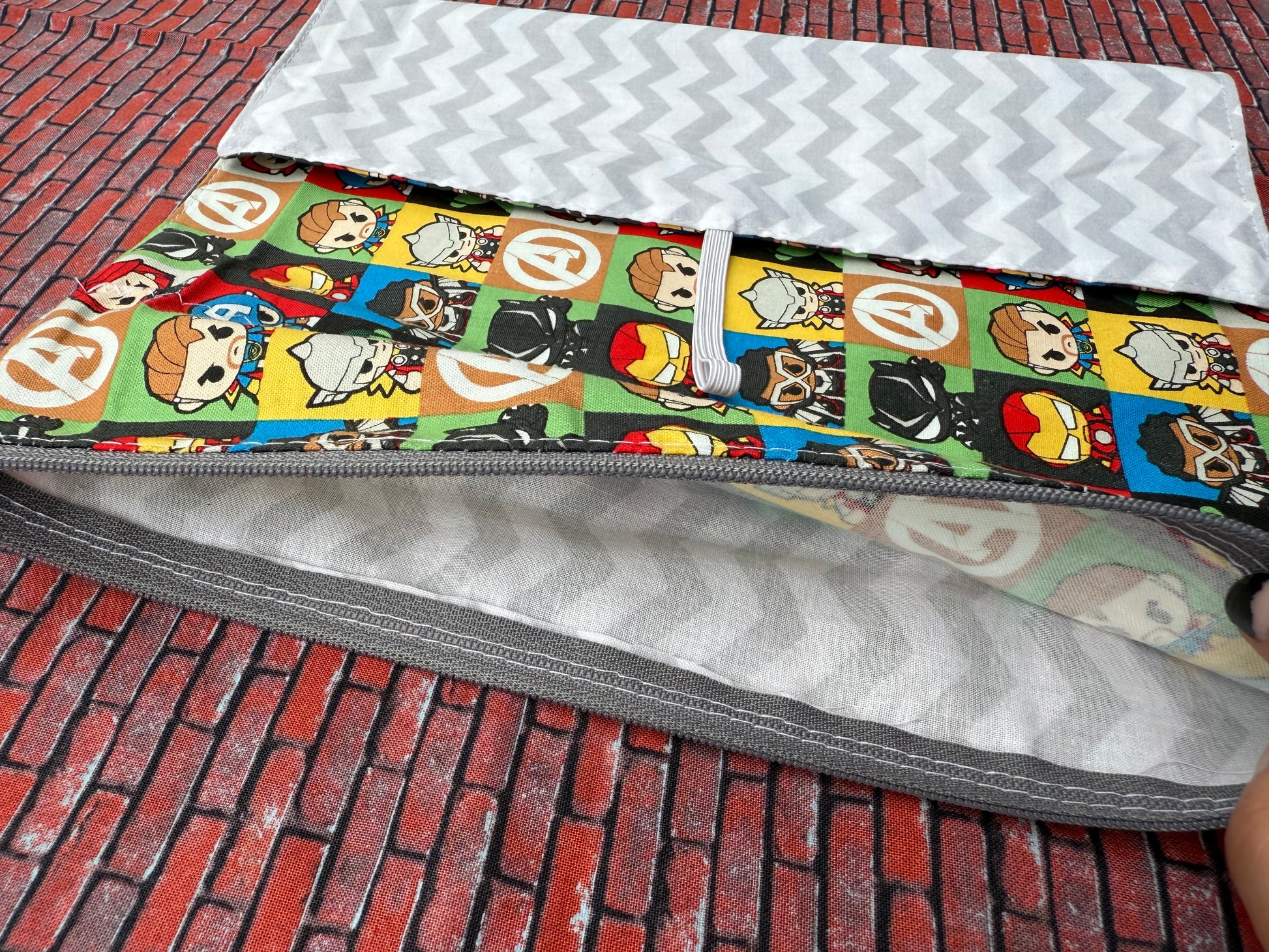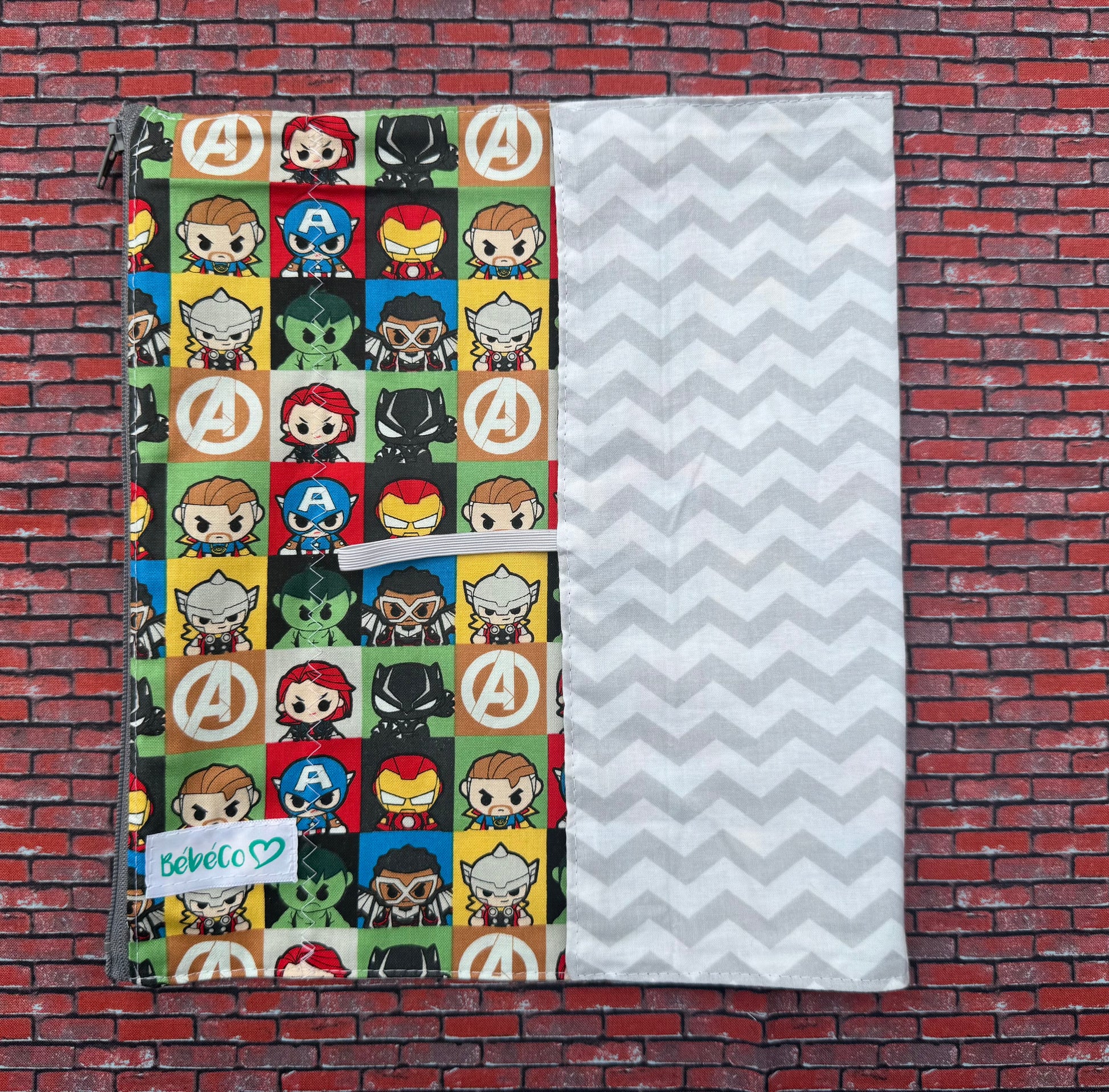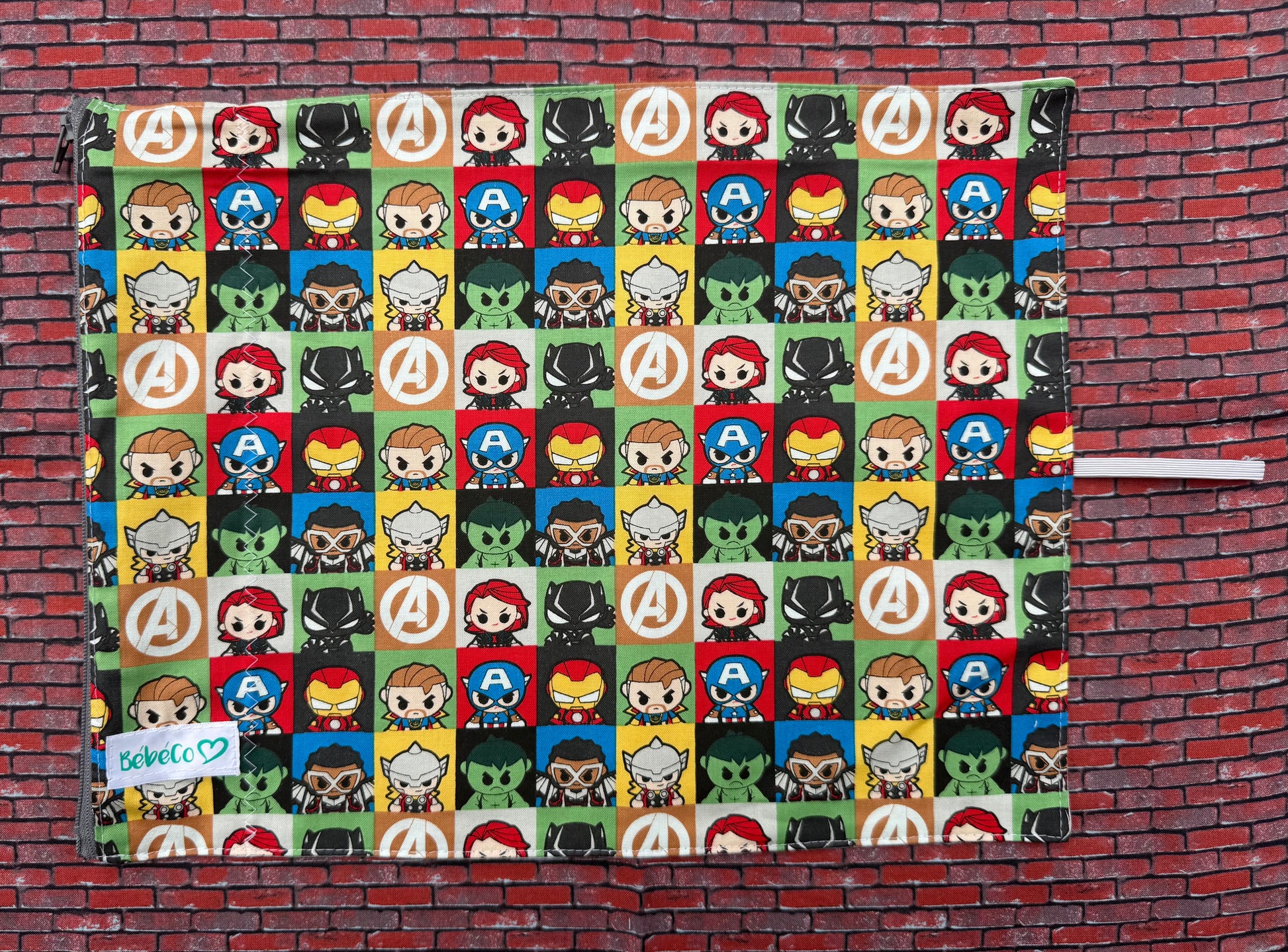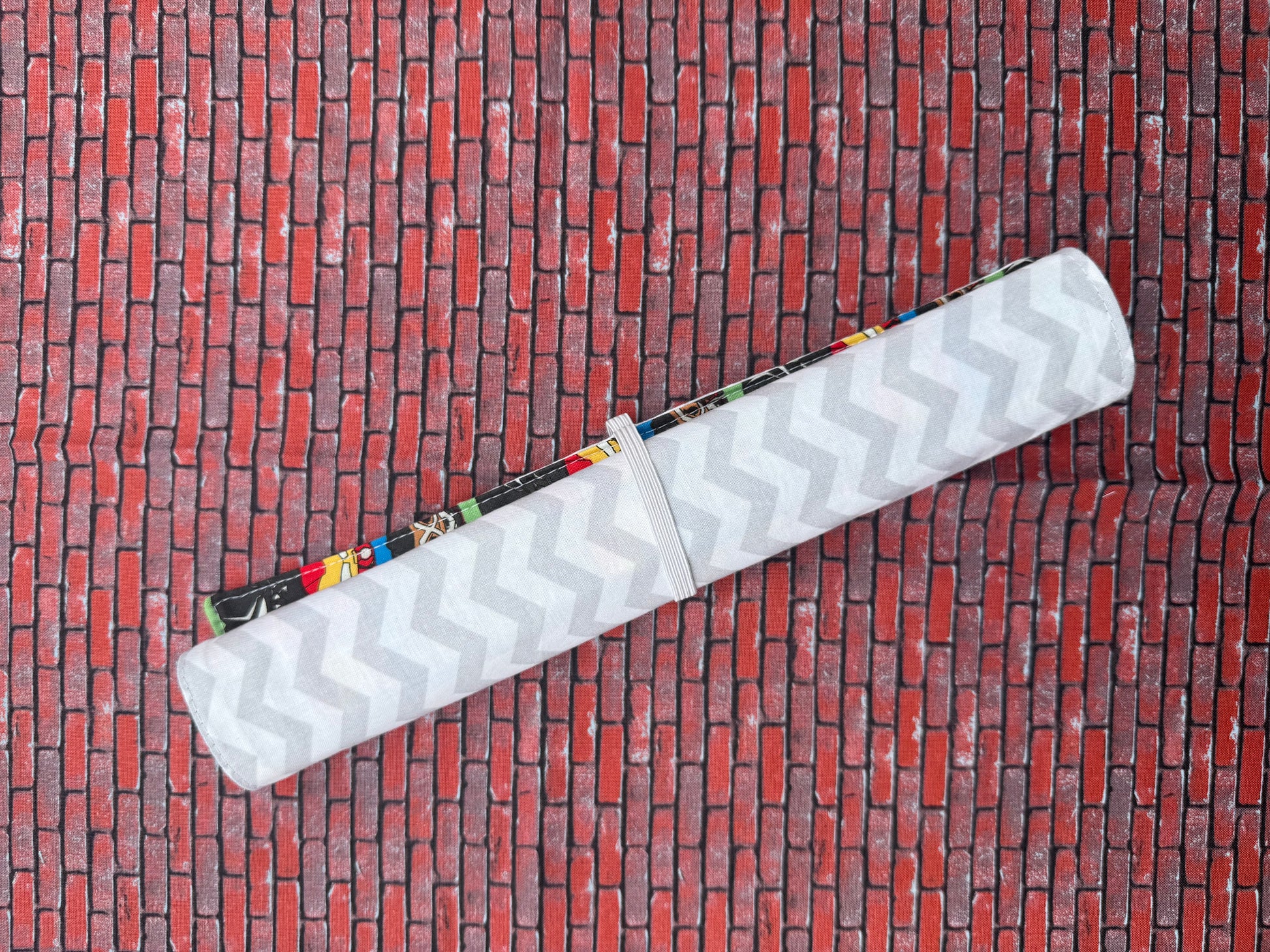 Petit napperon en coton avec pochette pour les ustensiles. Très facile à ranger on le roule et on attache avec l'élastique. Le napperon est également réversible, un motif plus intense au devant et un motif plus neutre à l'endos.