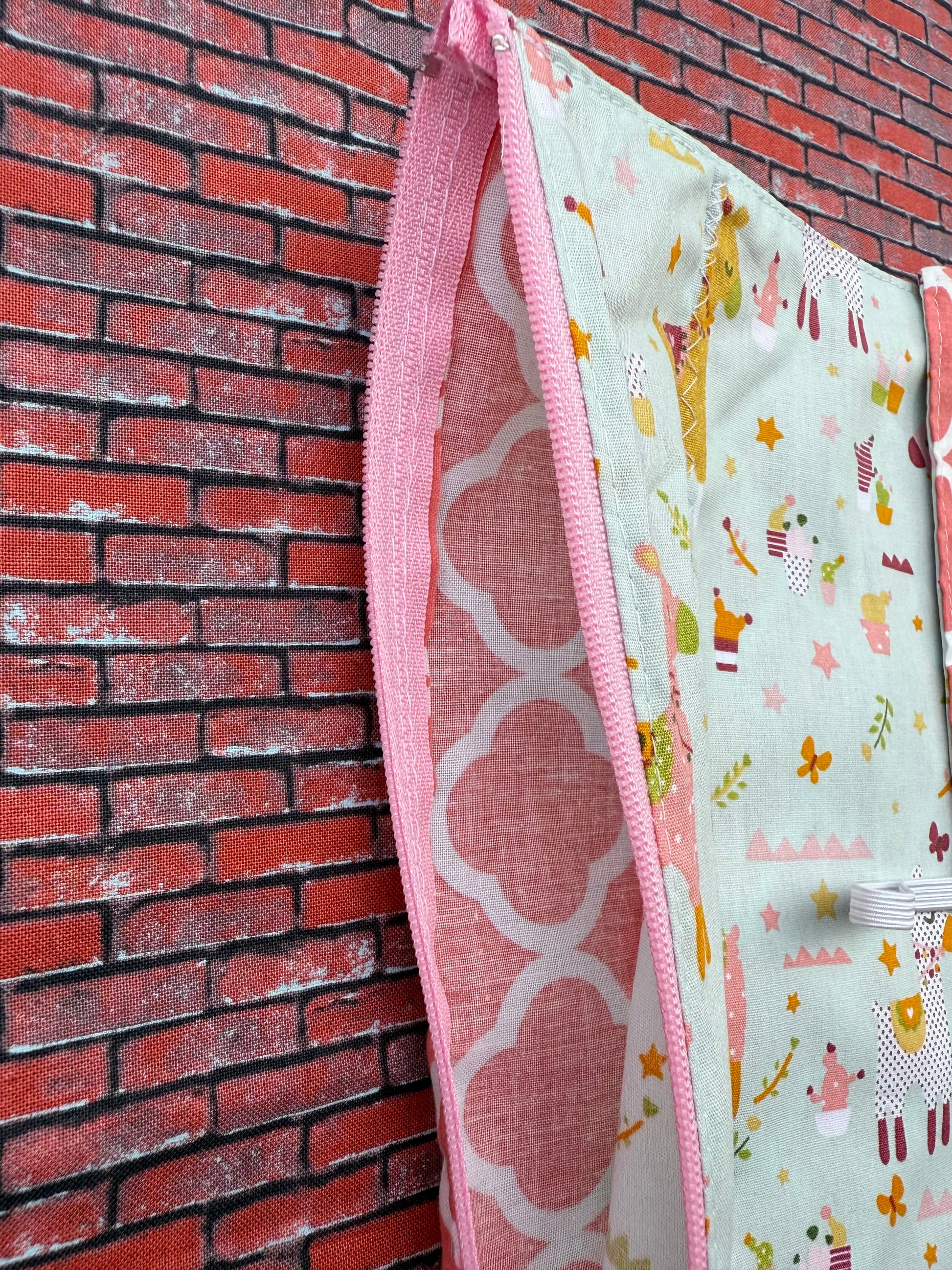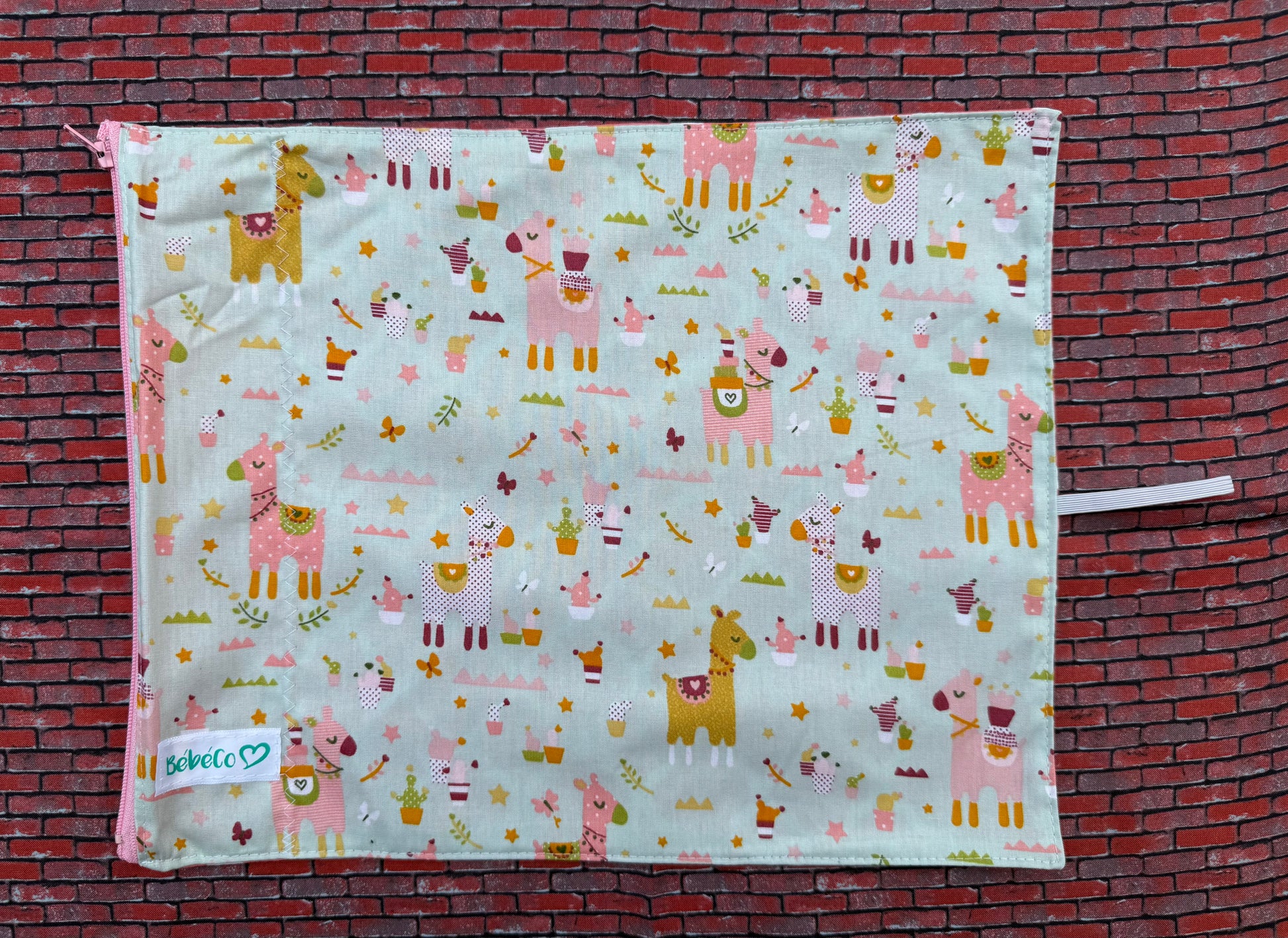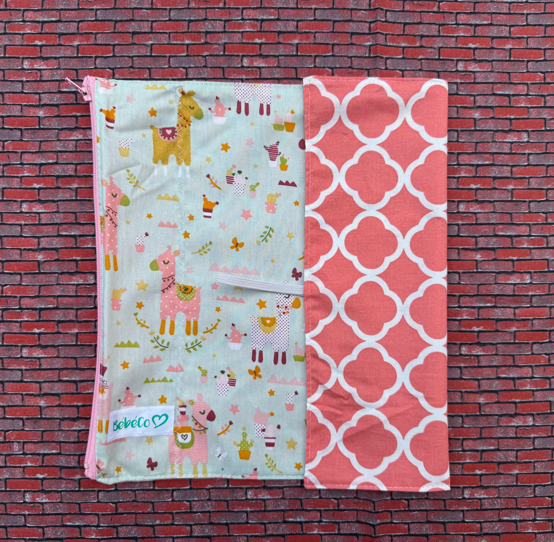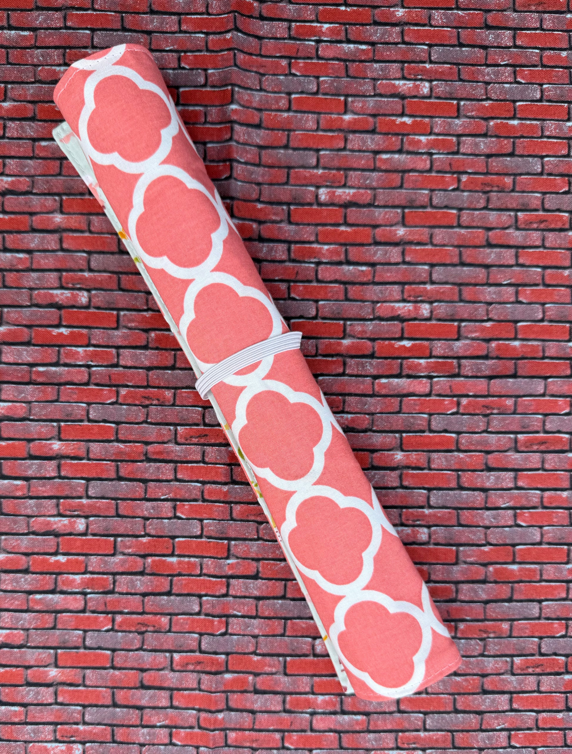 Petit napperon en coton avec pochette pour les ustensiles. Très facile à ranger on le roule et on attache avec l'élastique. Le napperon est également réversible, un motif plus intense au devant et un motif plus neutre à l'endos.