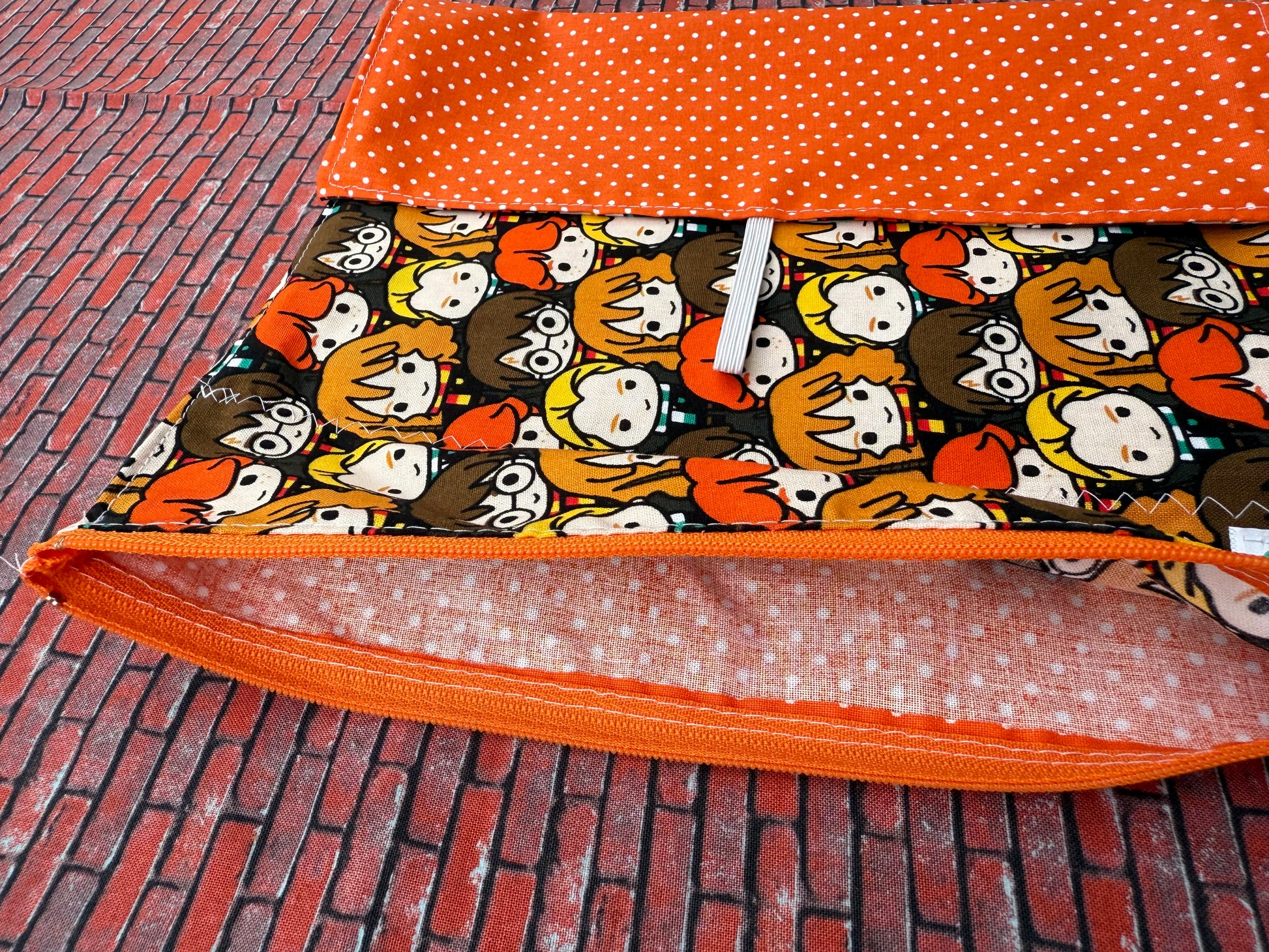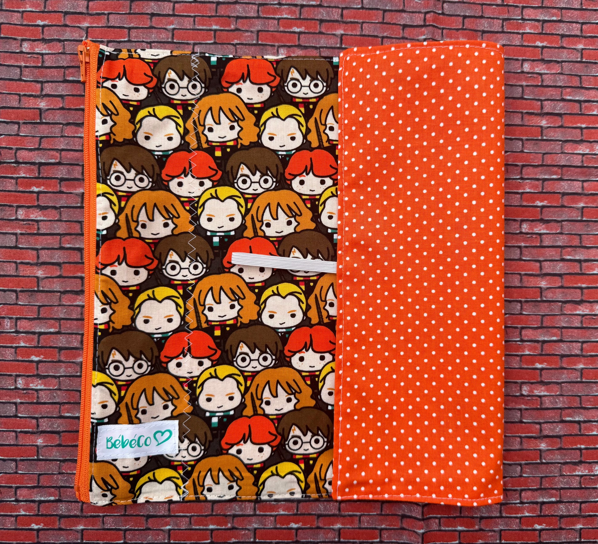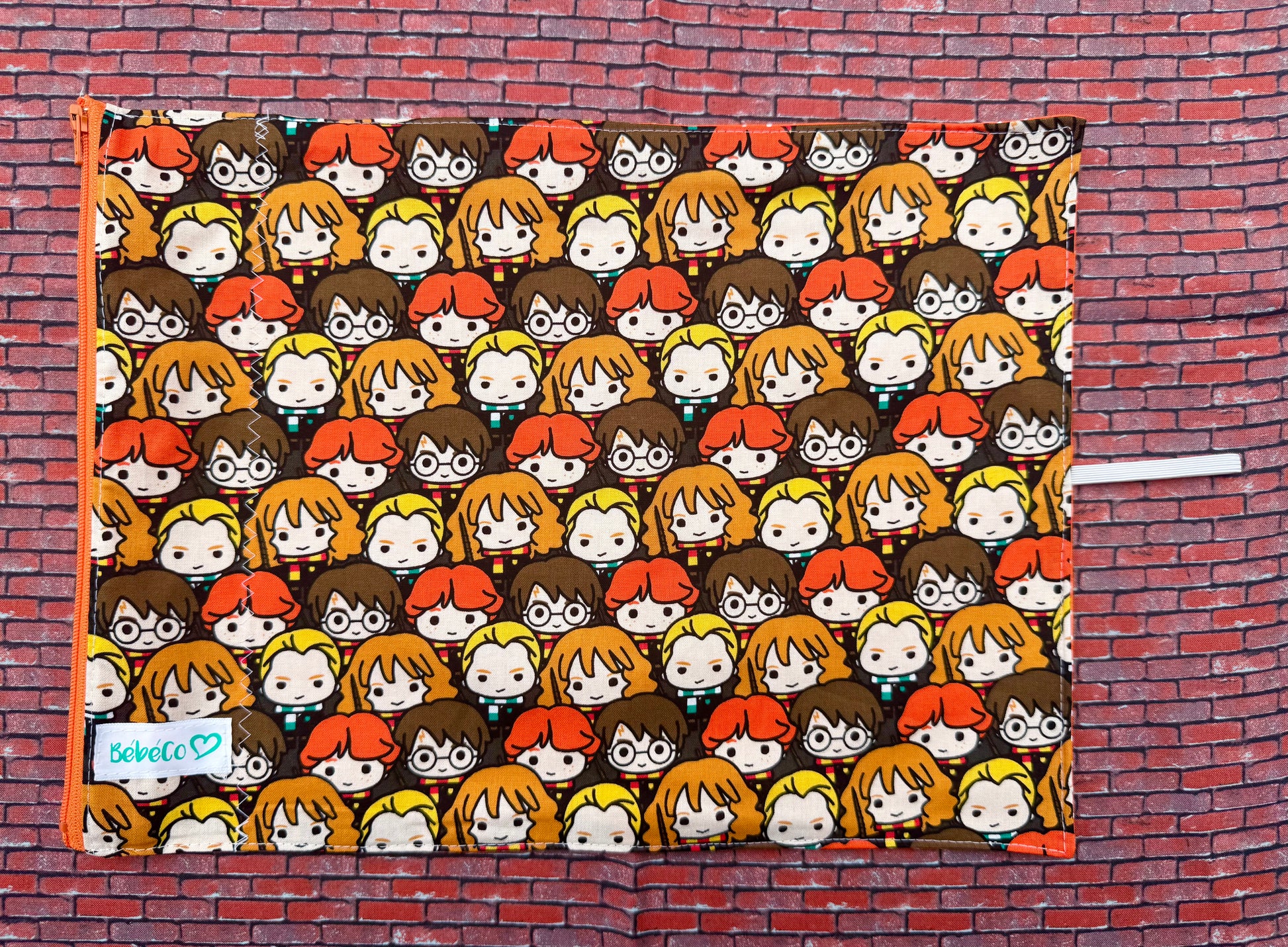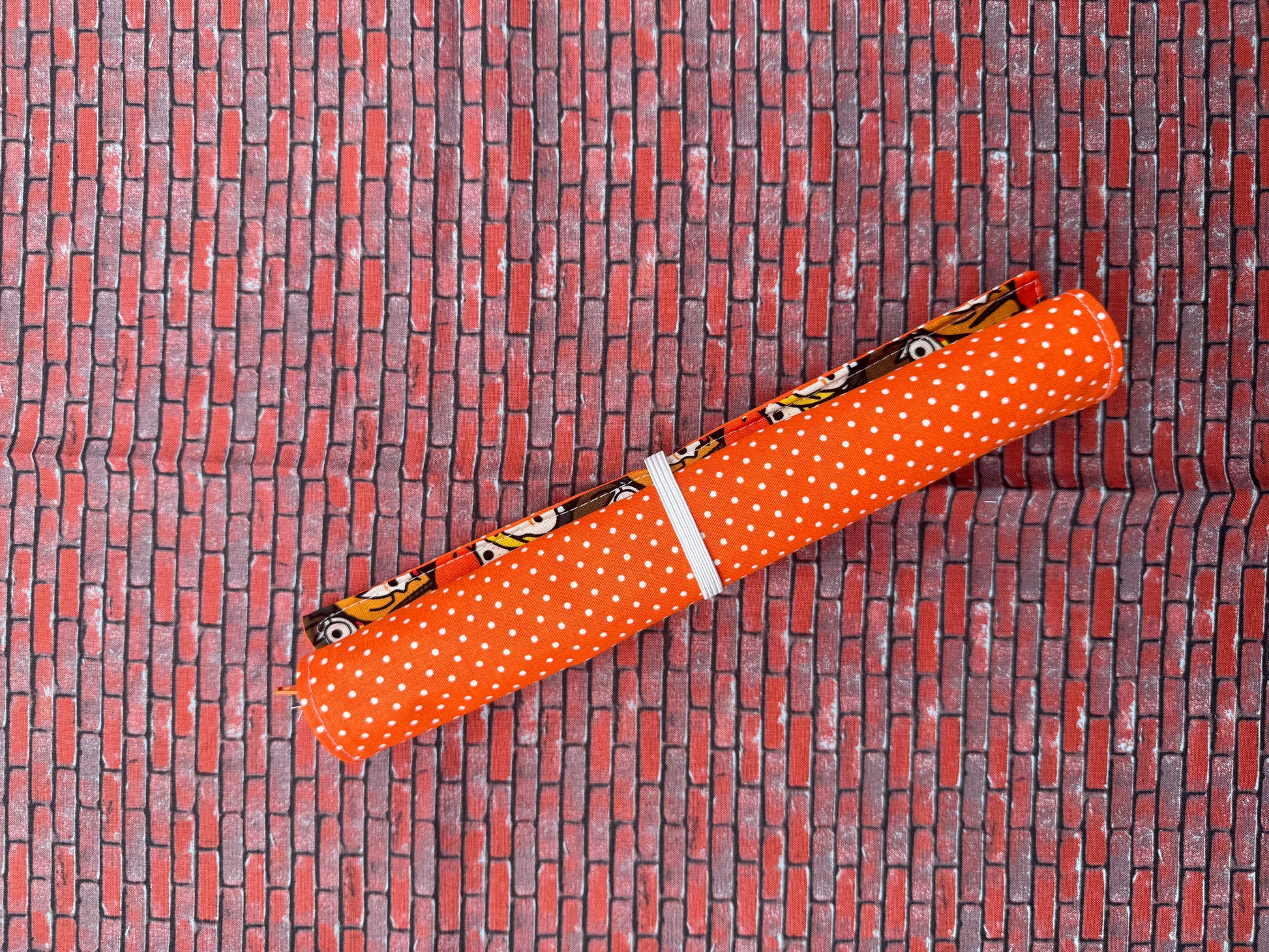 Petit napperon en coton avec pochette pour les ustensiles. Très facile à ranger on le roule et on attache avec l'élastique. Le napperon est également réversible, un motif plus intense au devant et un motif plus neutre à l'endos.