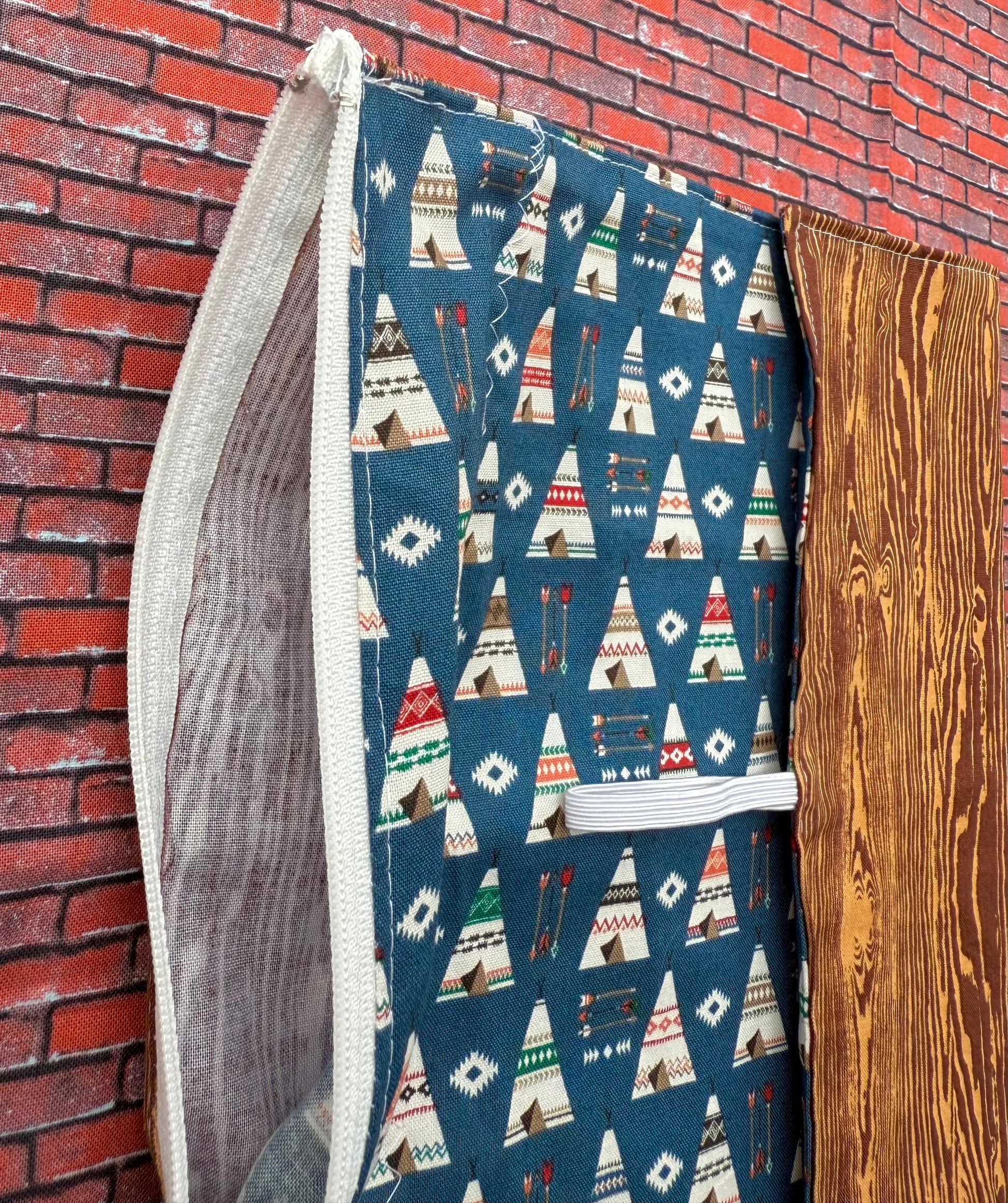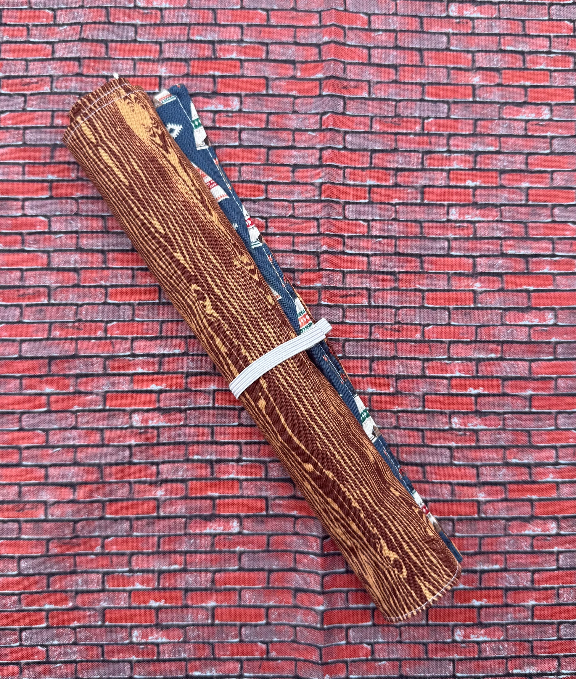Petit napperon en coton avec pochette pour les ustensiles. Très facile à ranger on le roule et on attache avec l'élastique. Le napperon est également réversible, un motif plus intense au devant et un motif plus neutre à l'endos.